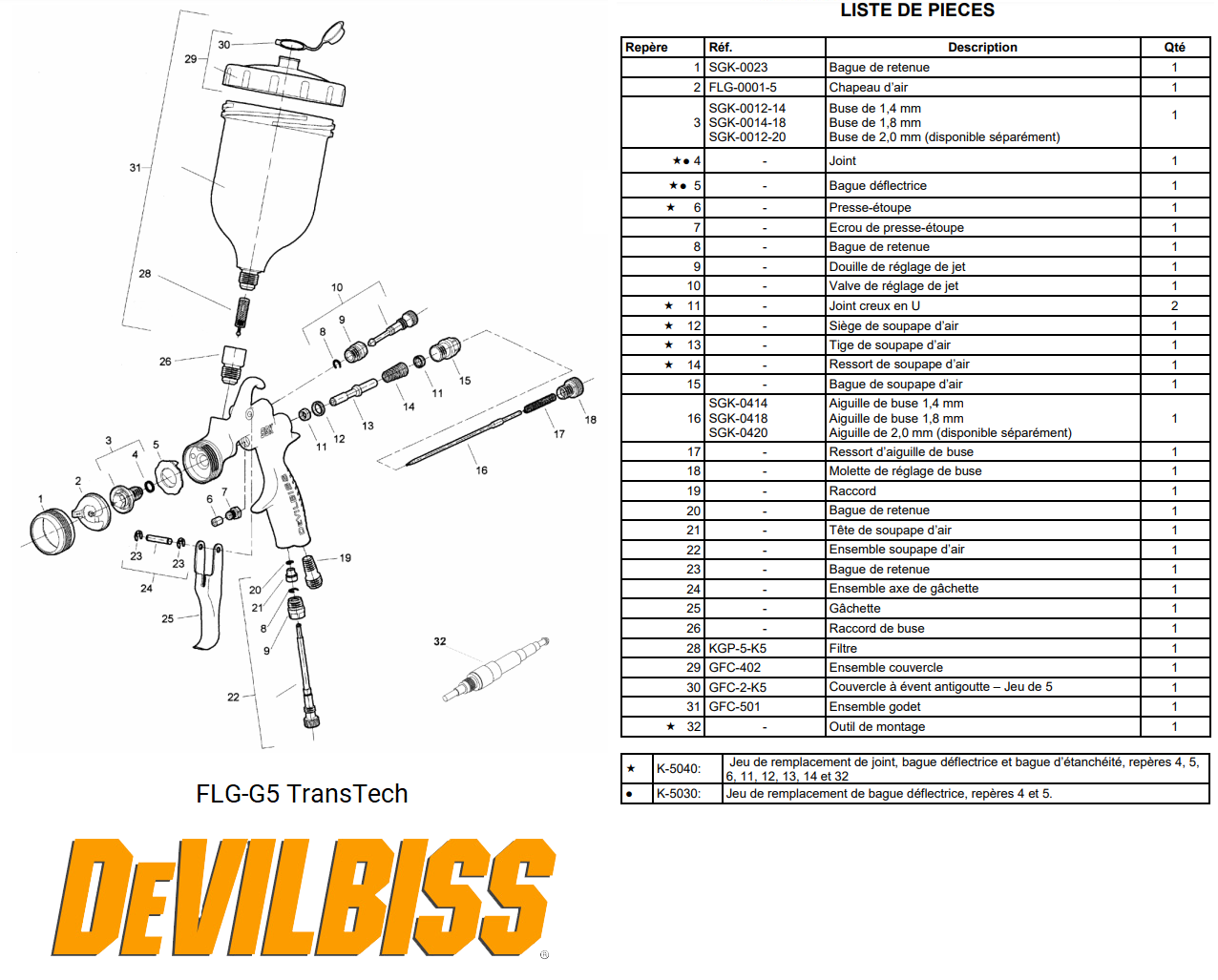 Retrouvez les pièces détachées du pistolet FLG5 Devilbiss.