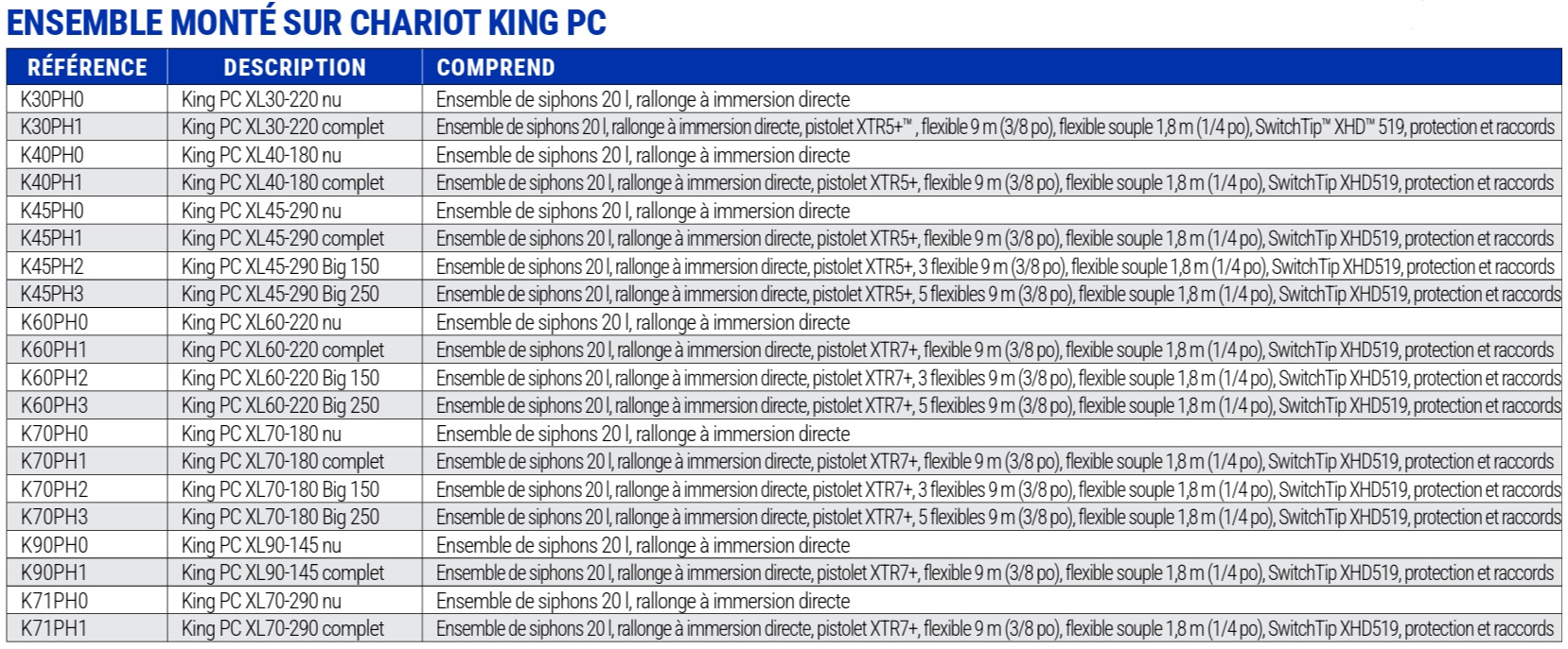 • Complet : Ensemble de siphons 20 l, rallonge à immersion directe, pistolet XTR5+™ , flexible 9 m (3/8 po), flexible souple 1,8 m (1/4 po), SwitchTip™ XHD™ 519, protection et raccords.